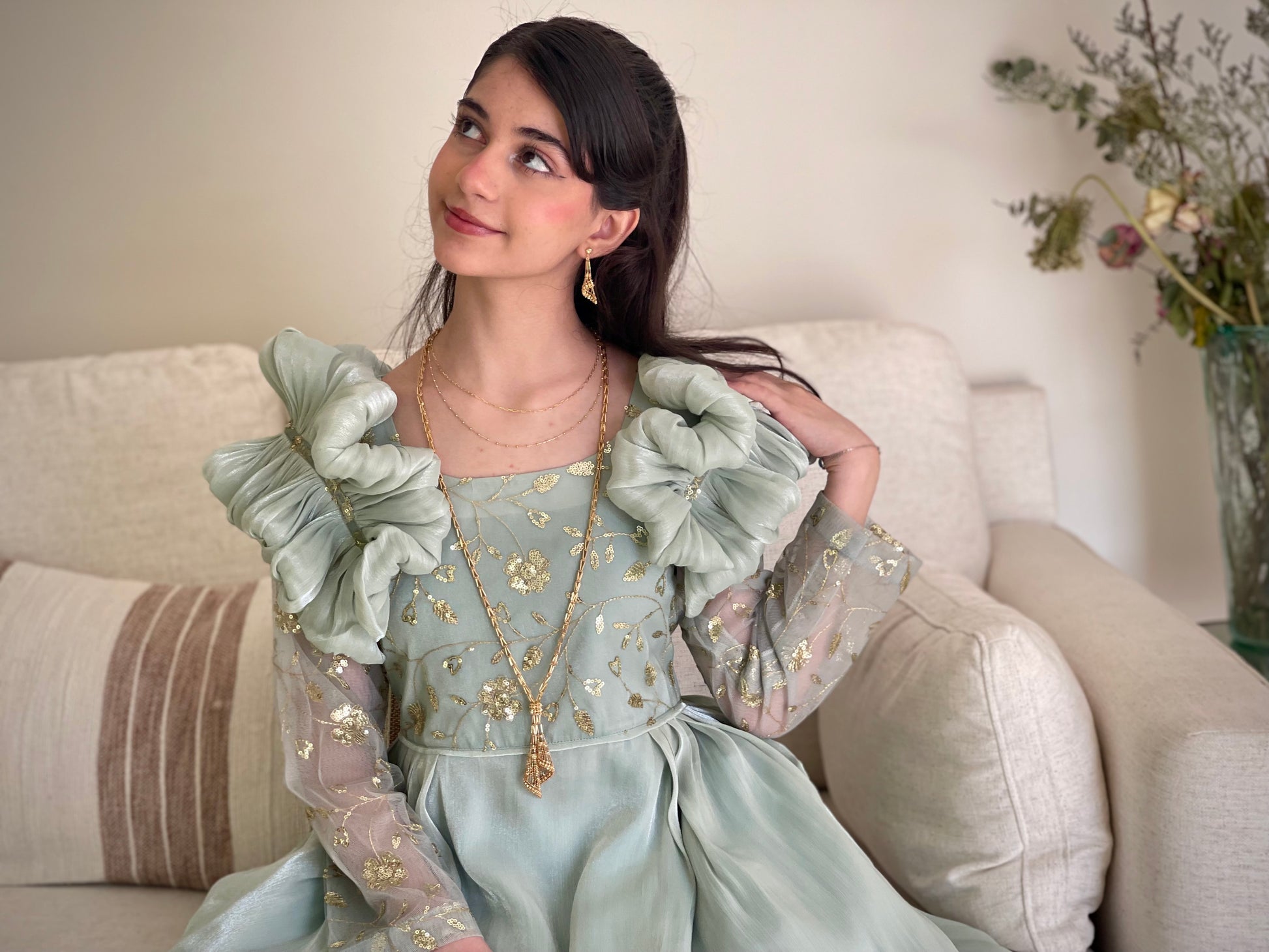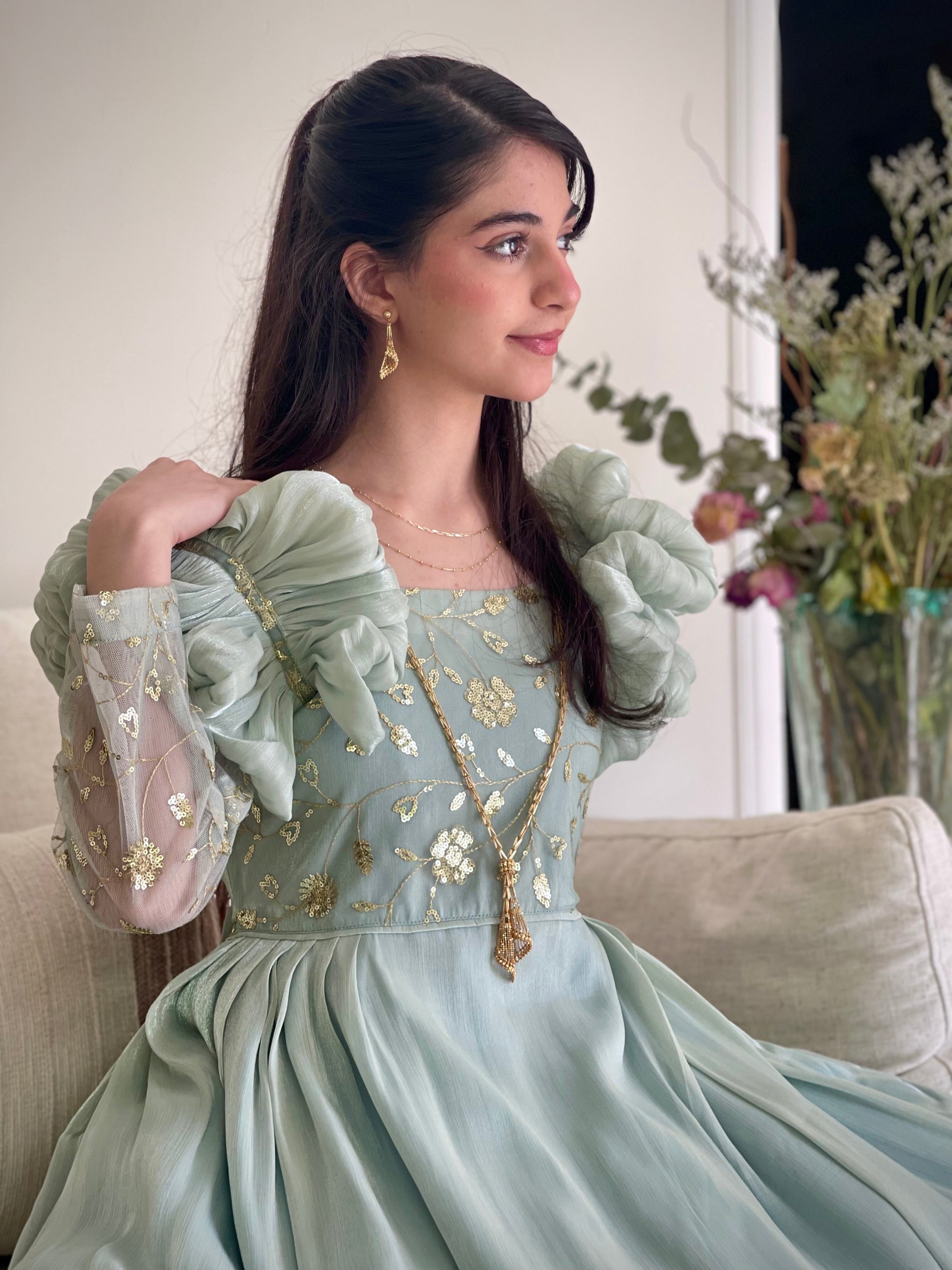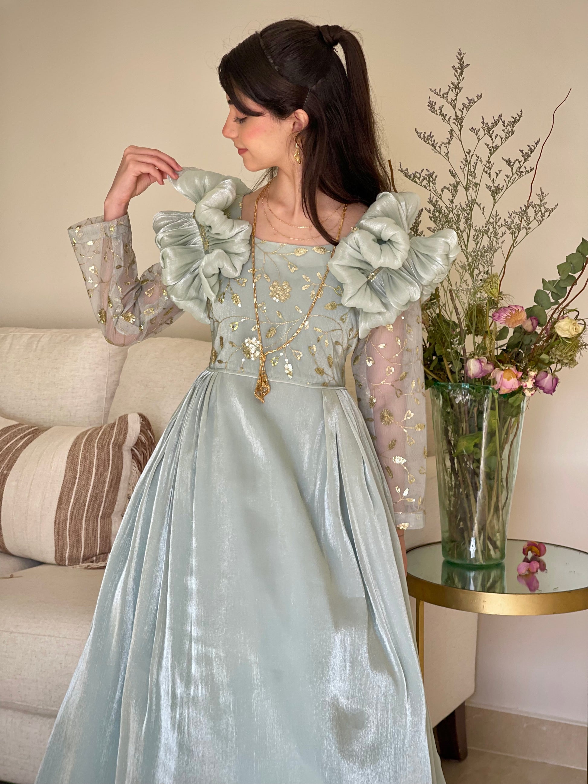 فستان روز اورحنزا مع صدرية مشغوله وجيبون داخلي منفصل