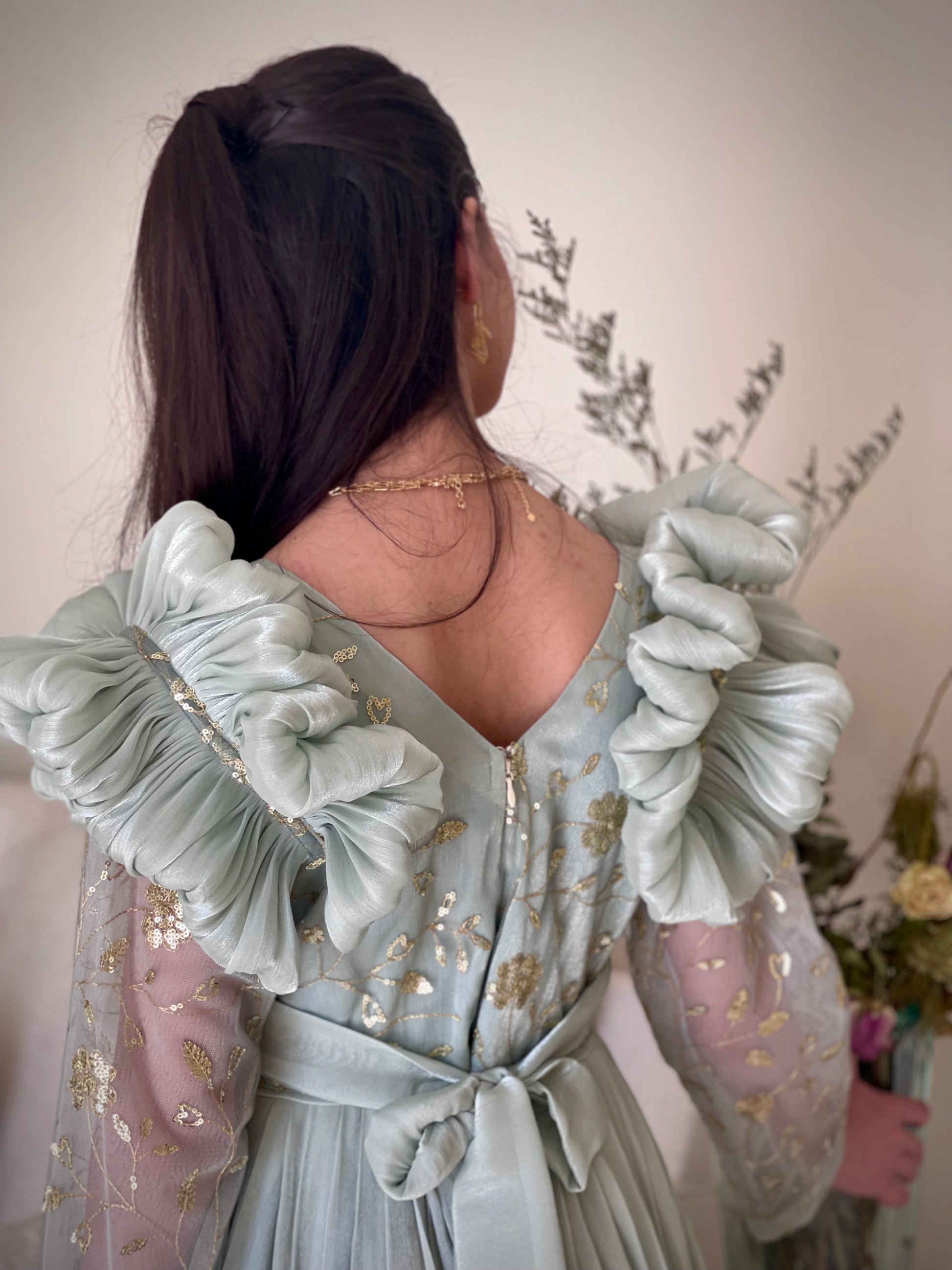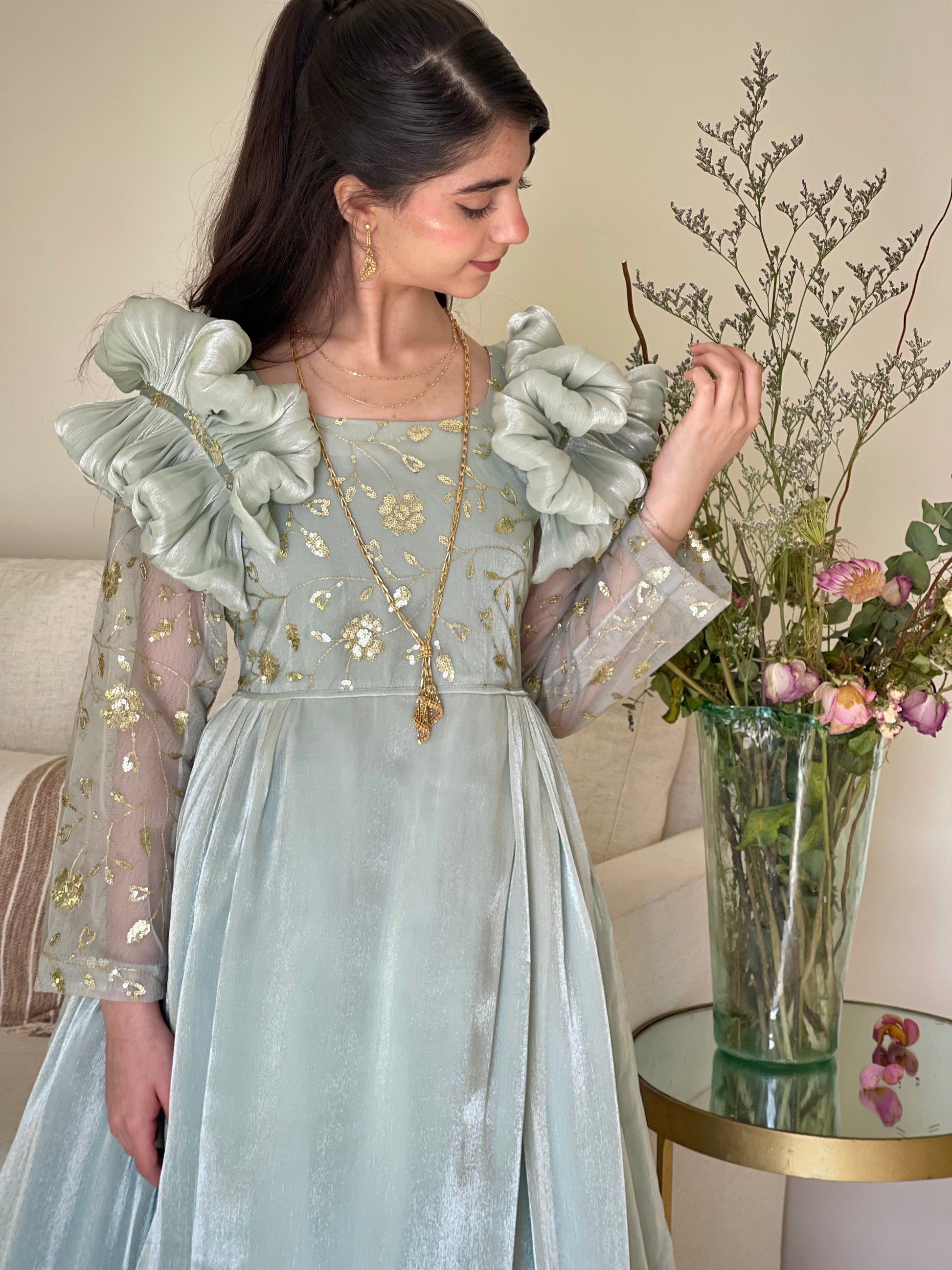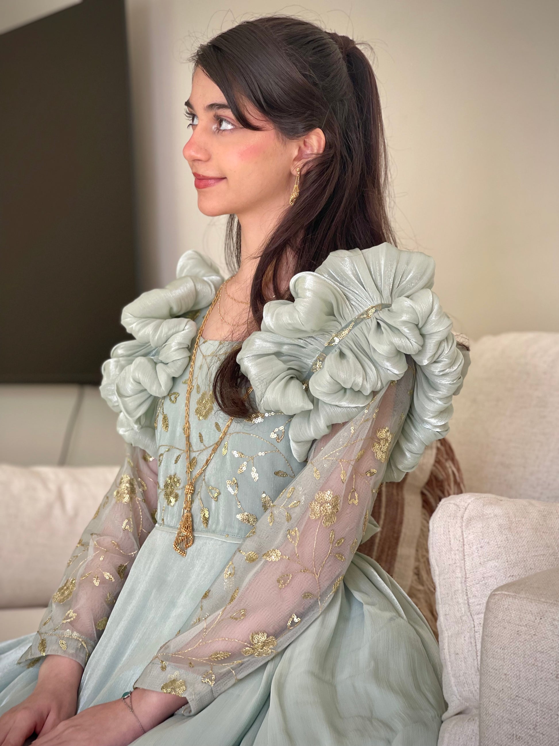 فستان روز اورحنزا مع صدرية مشغوله وجيبون داخلي منفصل