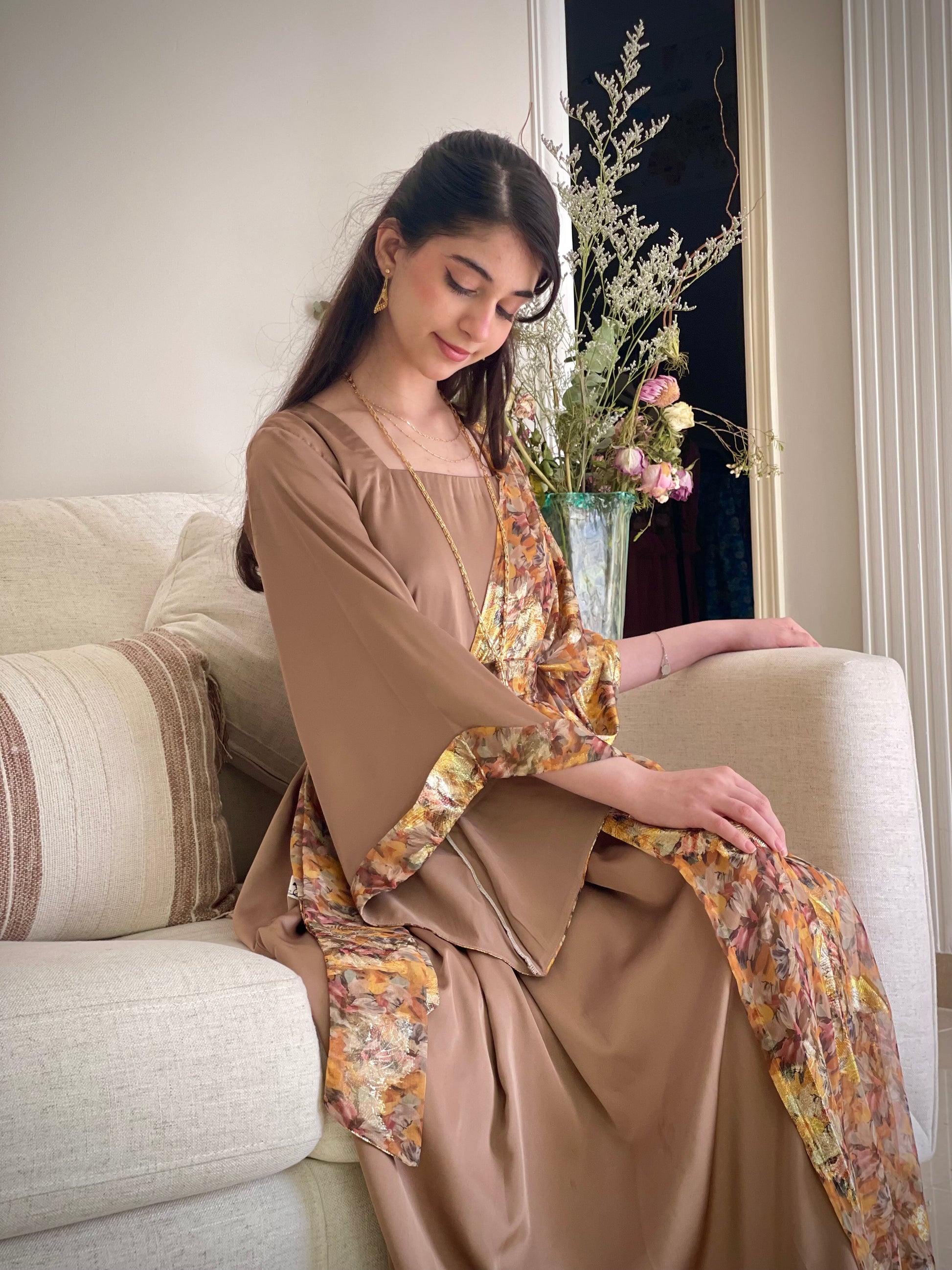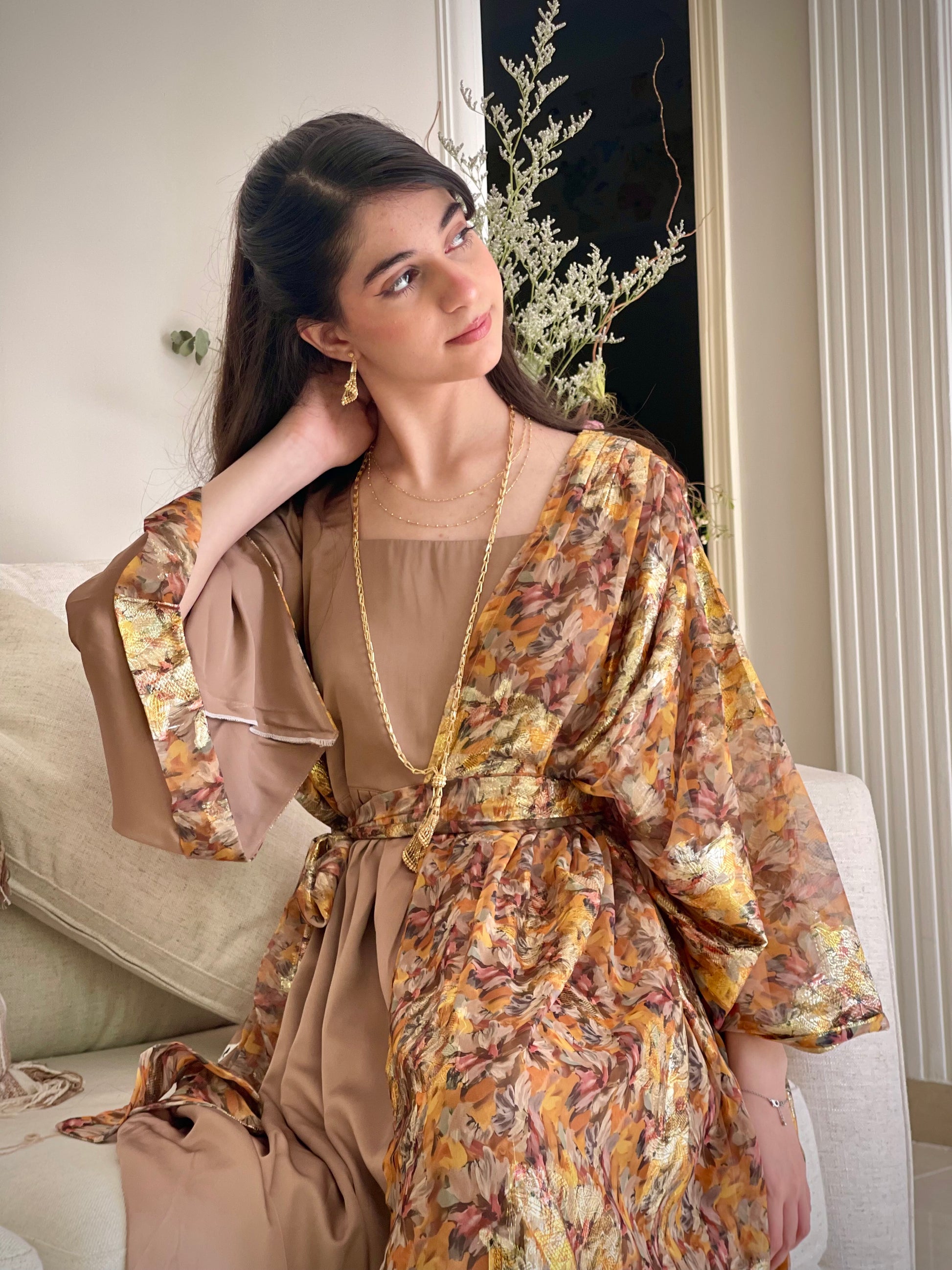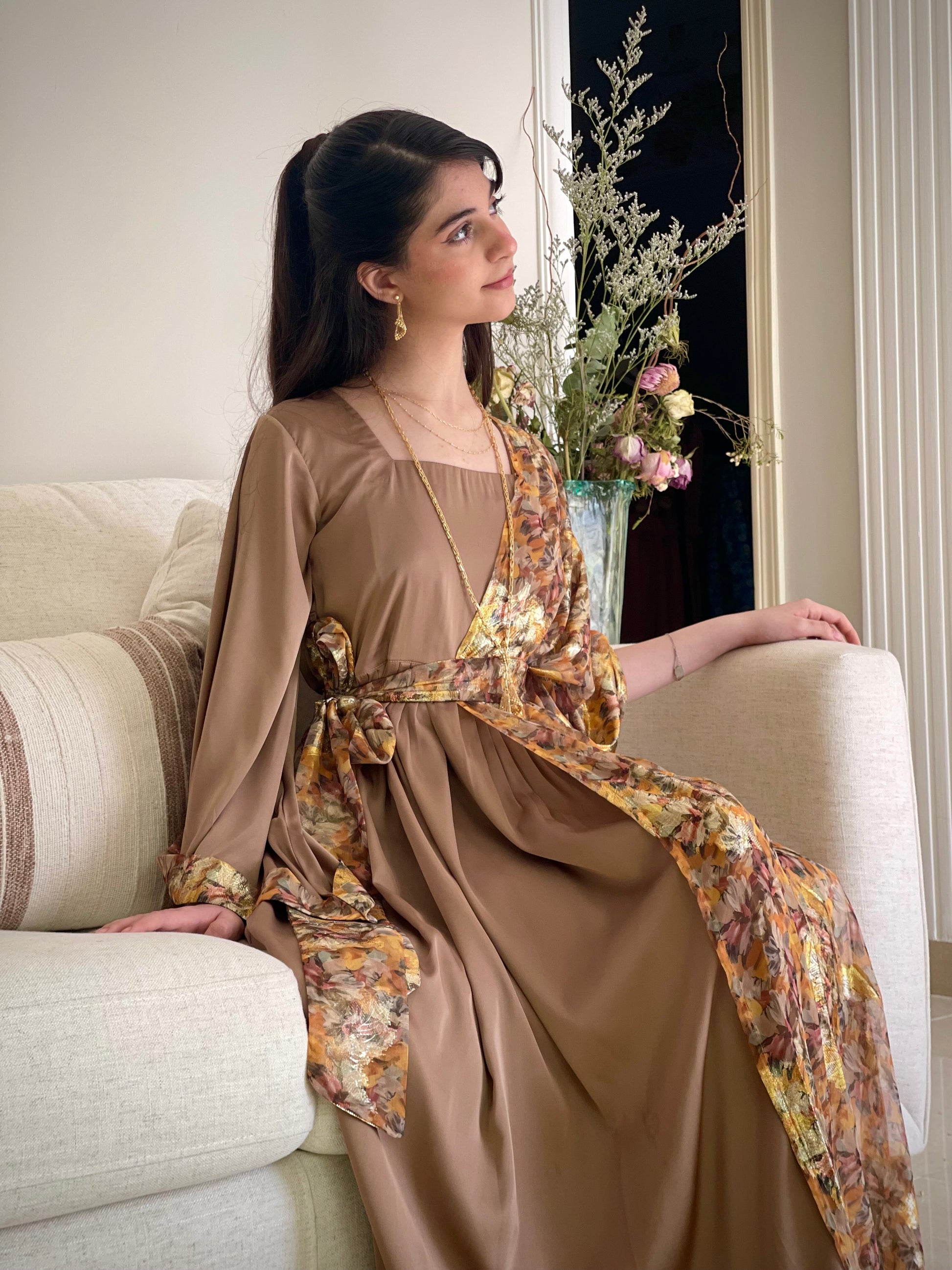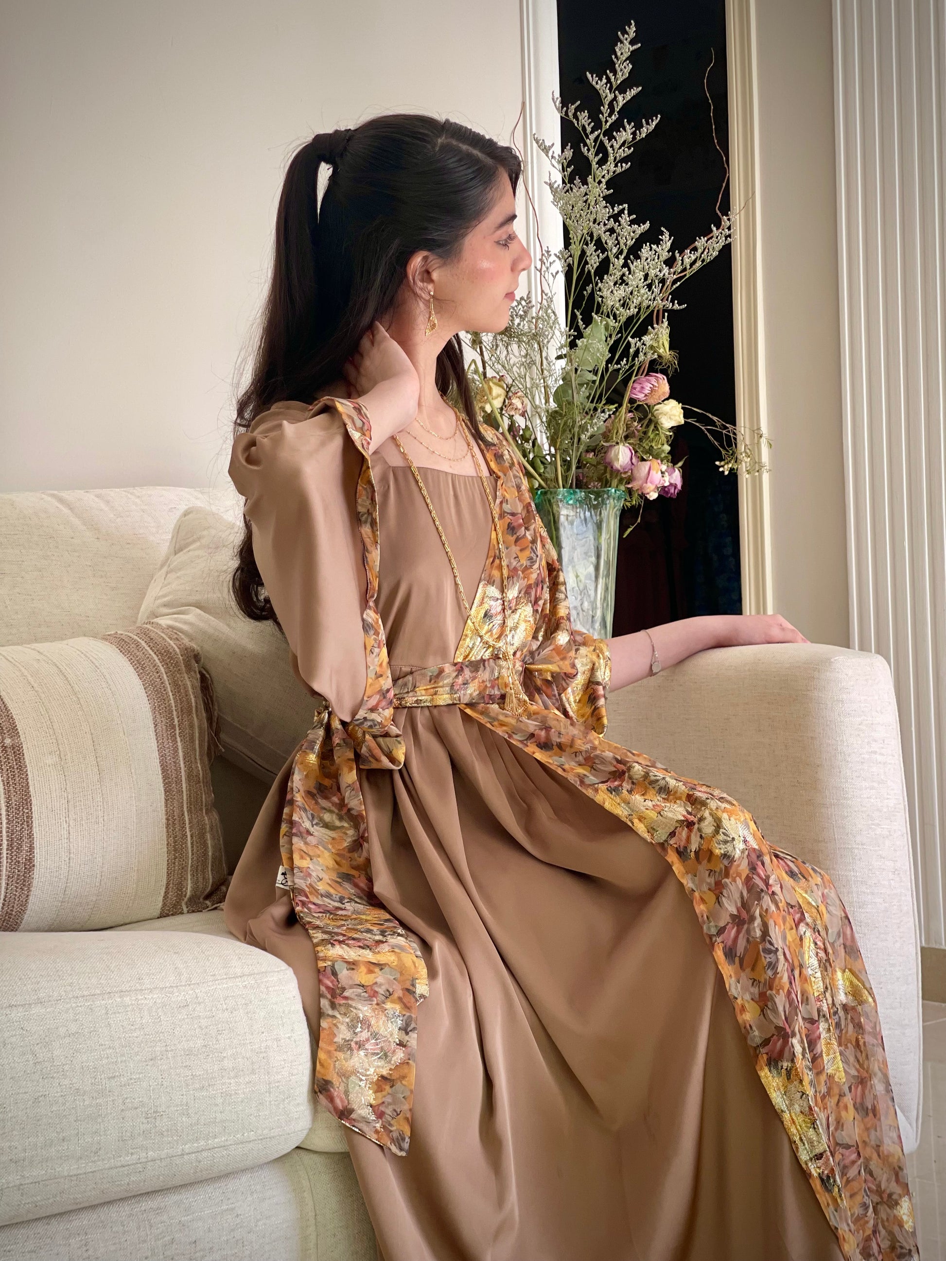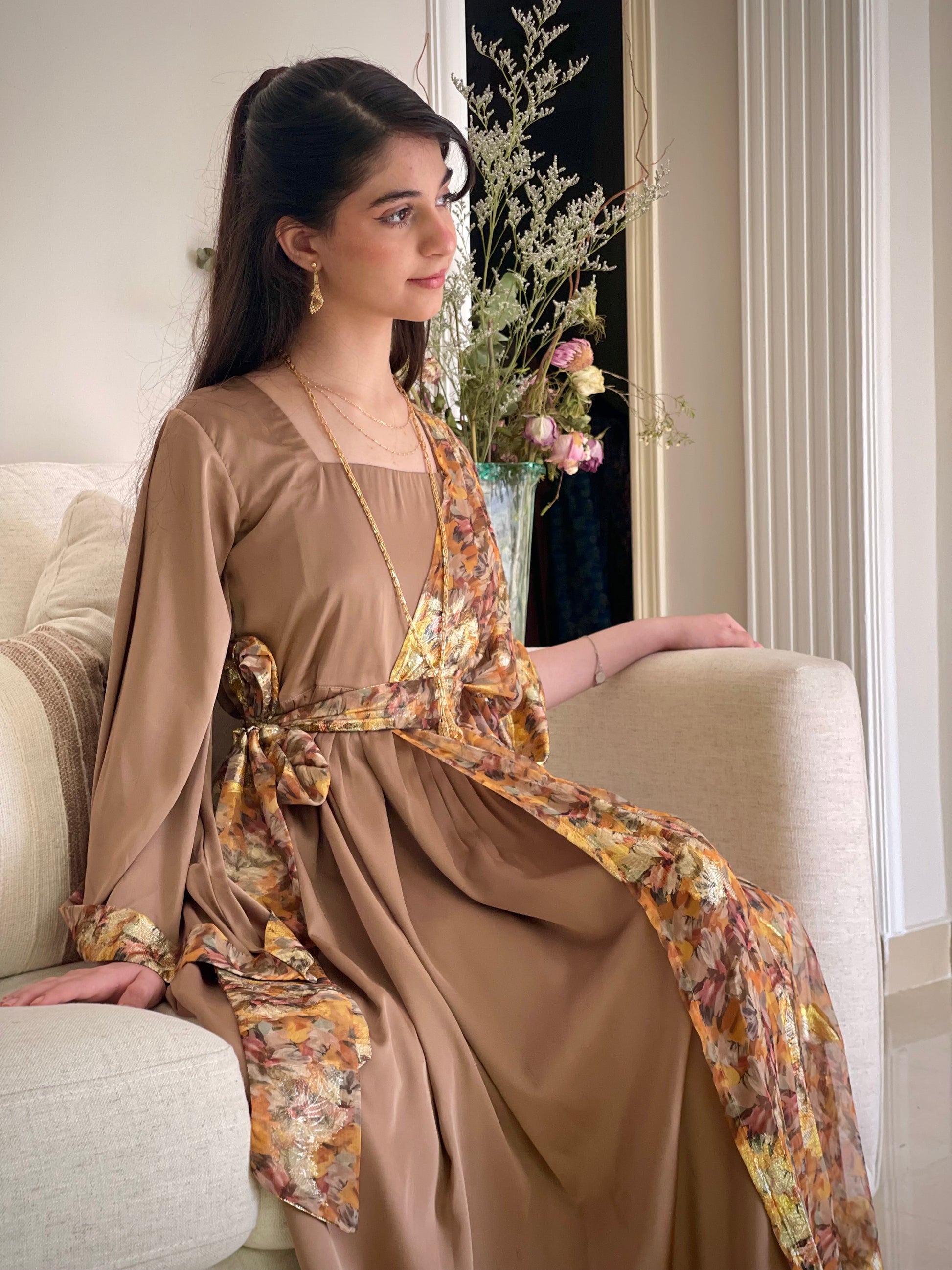 فستان من الشيفون المزراي والحرير الساده