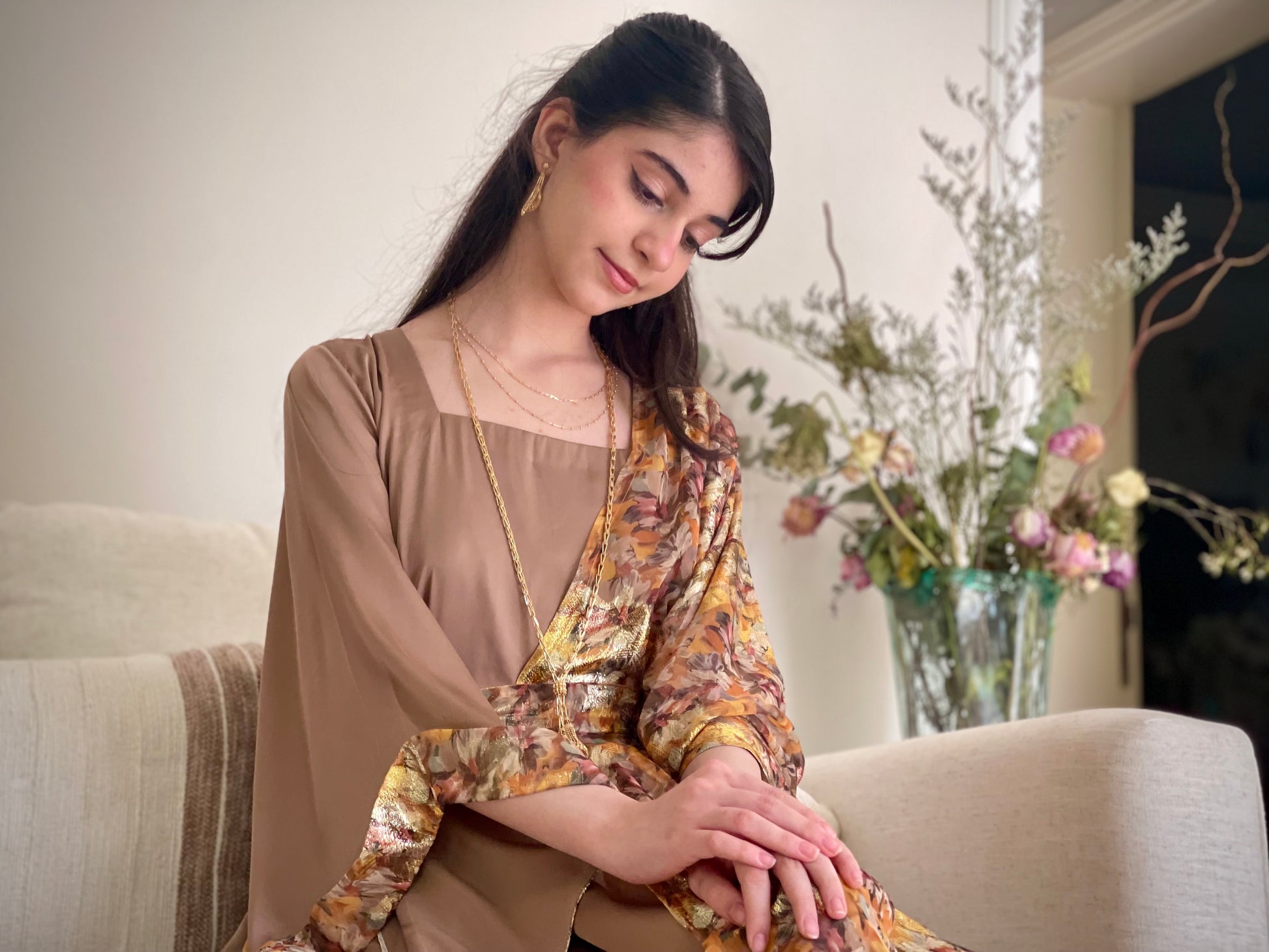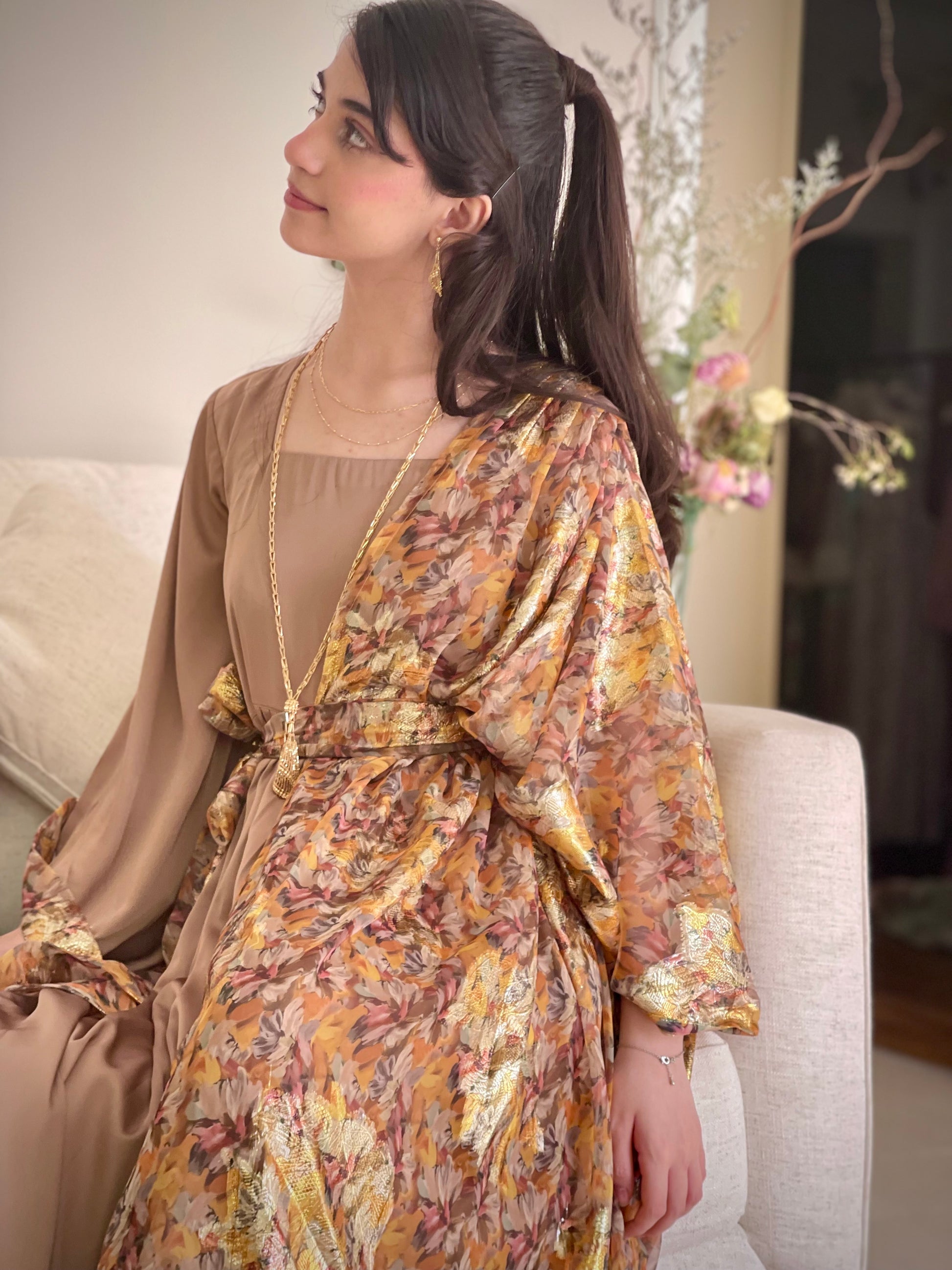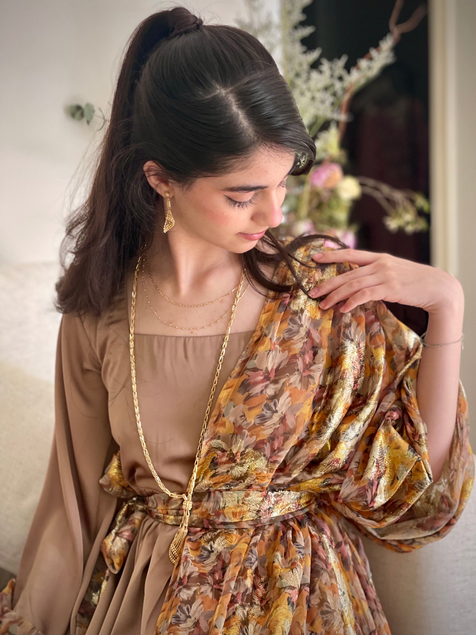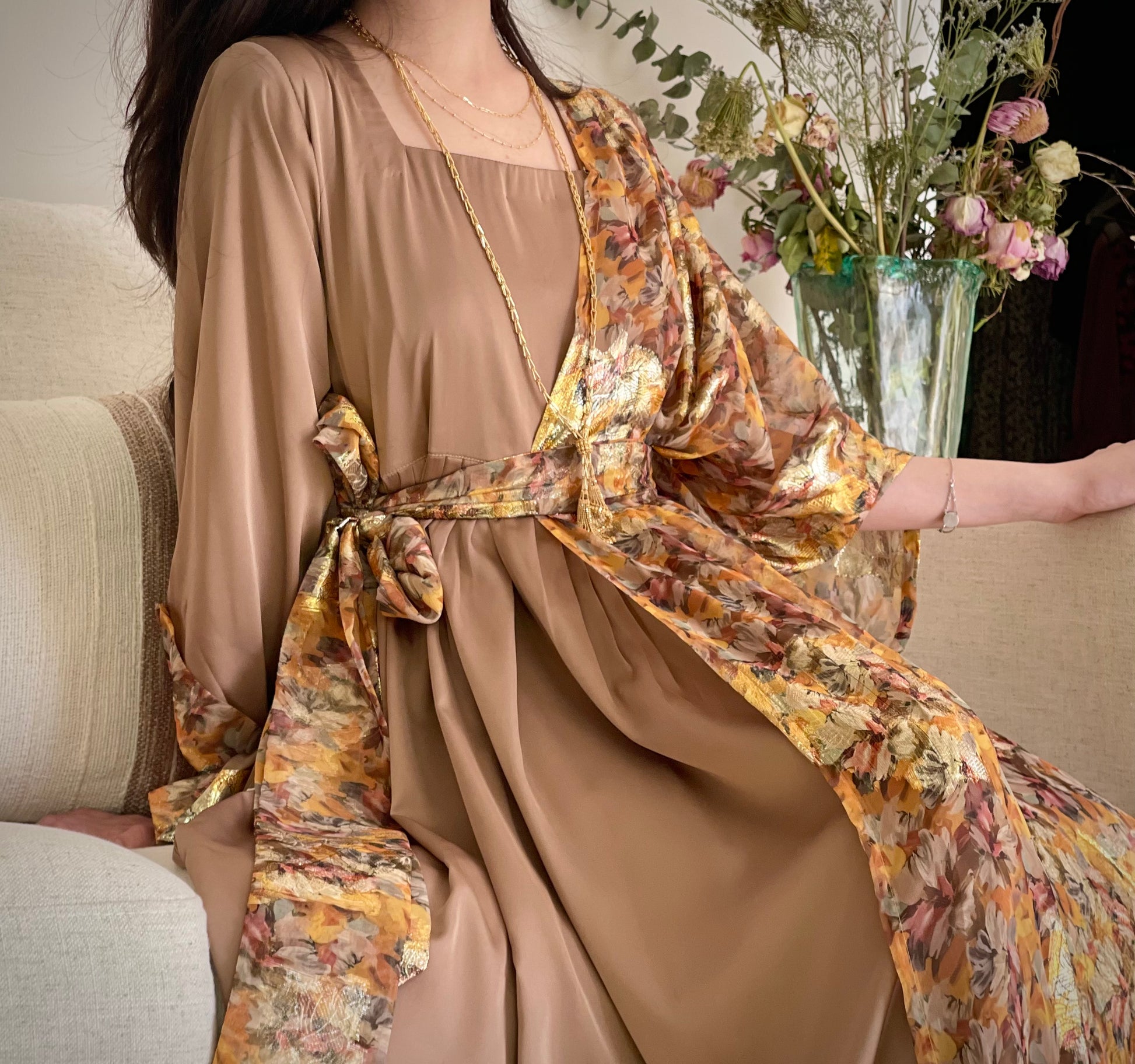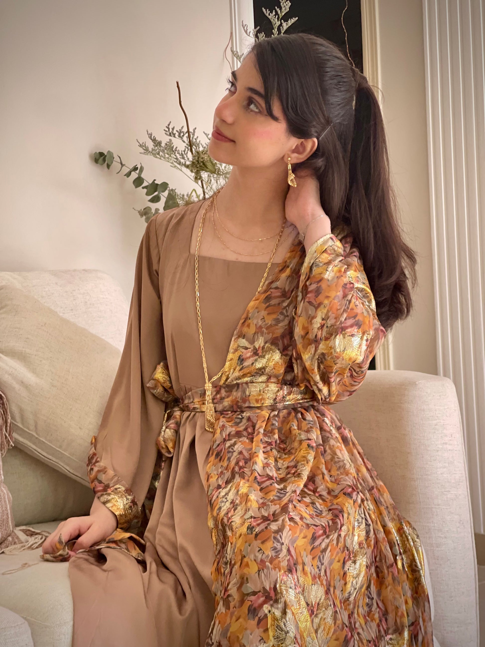 فستان من الشيفون المزراي والحرير الساده